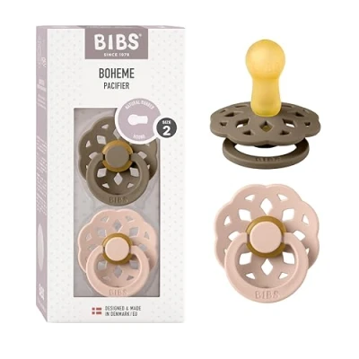 Avec sa silhouette romantique et artistique, BIBS Bohème s\'inspire du style bohème moderne avec un une profonde reconnaissance pour mère nature. Le style bohème combine des éléments naturels tels que le bois, le rotin et le macramé aux motifs artistiques, extravagants et organiques qui rendent ce nouveau design frais, créatif et super mignon. Design exclusif et original créé et fabriqué au Danemark par BIBS. Ce sont des sucettes en PP, sans BPA pas de phtalates, pas de PVC. Elles sont conformes à la norme EN1400 et sont testées régulièrement au Danemark par Consumer Lab Denmark. En outre, elles ont passé de manière satisfaisante, les derniers tests effectués par notre département de qualité en Europe. Attention !La différence entre la taille 0-6M et la taille 6-18M est à peine perceptible à la vue. En taille 0-6 mois, elle est un peu plus courte et plus large en bas (la partie la plus étroite). Vous pouvez voir la photo de la comparaison des deux sucettes pour voir la légère différence entre les tailles. La marque conseille de changer la sucette toutes les 6 semaines, parce que le caoutchouc naturel (que ce soit de la marque qui soit) lorsqu\'elle est souvent utilisée, elle se gonfle et s\'élargit. Et cela peut entraîner l\'achat d\'une nouvelle sucette de la même taille et que l\'enfant peut refuser cette tétine même si c\'est le même qu\'il avait.CaracteristiquesElles ne peuvent pas être personnalisées.Tétine : tétine ronde en 100 % sans caoutchouc naturelSans BPA, PVC et phtalatesFabriqué au Danemark. Elle est conforme à la réglementation stricte EN1400.Le fabricant recommande de changer la sucette toutes les 6 semainesIl ne comprend pas de capuche de protection.Nous ne recommandons jamais la stérilisation au micro-ondes. Et dans ce cas, étant une sucette en PP et dont l\'assemblage est réalisé avec le même caoutchouc que la tétine, les températures élevées non contrôlées, peuvent provoquer le démontage de la sucette. Notre recommandation est de chauffer une casserole d\'eau, de la faire bouillir, de la retirer du feu et mettre les sucettes de 2 à 5 minutes.Dimensions :Hauteur 4,9 cm x largeur 4,5 cmLongueur sans rondelle 0-6 m : 4 cm,Longueur sans rondelle 6-12 m : 4,4 cm
