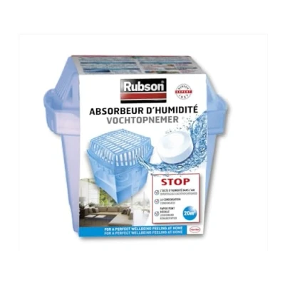 KauflandAbsorbeur d'humidité Rubson 1852173 fonctionne avec une Tab basique, particulièrement adapté pour les pièces allant jusqu'à 20m². Assainit l'air des pièces. Évite le décollement du papier peint, les moisissures (sur les murs, tapisseries), les odeurs de moisi, la condensation. Recharges ultra absorbantes. Lutte efficacement contre les mauvaises odeurs. - Type de produit : Absorbeur. Utilité : Absorbeur d'humidité. Approprié pour une salle jusqu'à : 20 m². Largeur : 160 mm. Profondeur : 165 mm. Hauteur : 147 mm. Poids : 450 g. Poids de la recharge : 450 g. Recharge incluse : Oui.