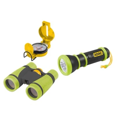 Dimensions des jumelles : environ 12 x 11 x 5 cm Grossissement 4x Dimensions de la lampe de poche : environ 16 x 4 cm Fonctionne avec 2 piles AA de 1,5 V Piles non incluses Taille de la boussole : environ 6 x 7 x 3 cm Avec rose facile à lire Couleur : gris/vert/jaune 4 ans et plus