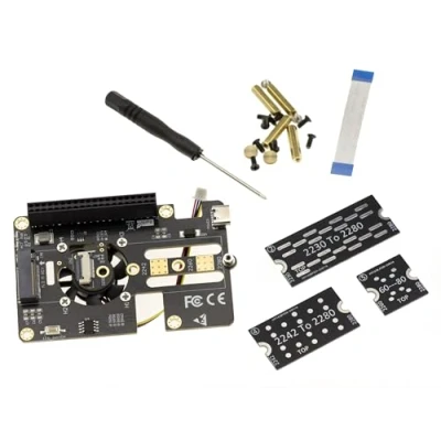 CdiscountPlaque dextension pour Raspberry PI5 permettant dajouter un SSD M2 NVMe. Inclut un connecteur PCIe NVMe et une nappe souple. Compatible avec les formats 2230 2242 2260 et 2280 avec alimentation par USB type C et ventilateur de refroidissement.