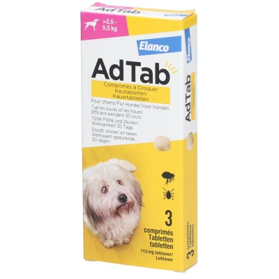 AdTab Chien > 2,5 Kg - 5,5 KgLibérez votre chien des puces et des tiques grâce au comprimé à croquer AdTab. Elanco a pour mission de prendre soin de votre animal de compagnie. C'est pourquoi la marque a créé ce comprimé à croquer pratique et appétent : afin d'éliminer efficacement les tiques et les puces et protéger votre chien comme il le mérite. L'ingrédient actif d'AdTab, le lotilaner, agit sur les récepteurs nerveux des tiques et des puces votre chien, offrant ainsi une protection et un traitement efficace pendant un mois. Grâce à son petit format et son goût de viande, cet anti-parasitaire pour chiens est très bien toléré et facile à administrer, soit directement dans la bouche, soit avec la nourriture. Ce comprimé anti-parasitaire pour chiens tue les puces et tiques en peu de temps, une fois qu'elles ont été exposées à la substance active contenue dans AdTab. Ce traitement contre les puces et les tiques convient aux chiens à partir de 8 semaines. Les avantages en un coup d'œil : Petit comprimé à croquer Goût de viande pour une administration facile Efficace dans les 6 heures contre les puces présentes et 8 heures contre les tiques présentes suivant l'administration Puissant contre les puces et les tiques Vendu sans ordonnance Disponible en 5 tailles en fonction du poids de votre chien Pour les chiens à partir de 8 semaines de 2,5 à 5,5 kg Produit par Elanco, fabricant de Seresto et Advantix Efficacité durable : Les comprimés à croquer anti puces AdTab offrent à votre chien une protection durable contre les puces et les tiques pendant un mois entier Facilité d'utilisation : Grâce à son petit format et son goût de viande, le comprimé anti-parasitaire est facile à administrer avec ou après la nourriture Protection: Le comprimé AdTab atteint sa concentration maximale dans le sang en seulement 2 heures, pour une protection de votre animal de compagnie Produit efficace : Tout comme Seresto, Advantix et les autres produits Elanco, ces comprimés anti puces pour chiens ont été soumis à des tests rigoureux Contenu de la boîte : 3 comprimés anti puces et anti tiques (112 mg de lotilaner) pour chiens de 2,5 à 5,5 kg à partir de 8 semaines d'âge ApplicationAdTab est un médicament vétérinaire. Lire attentivement la notice avant utilisation.
