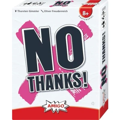 Pas de remerciements ! MBE3 On dit "Non merci !" lorsque c'est son tour de jouer et que l'on refuse la carte en posant un pion. Car la règle est la suivante : prendre la carte ou se défausser du pion. Si l'on prend une carte, on encaisse sa valeur en points négatifs. Seul celui qui utilise intelligemment ses propres pions gagne ! Le jeu de base a déjà été publié sous le titre 'Geschenkt ! Voici comment jouer à No Thanks ! MBE3 Mélangez les 33 cartes numérotées, mettez-en 9 de côté sans les voir et le reste en pile au milieu de la table Répartis les pions en fonction du nombre de joueurs, puis révèle la carte numérotée supérieure. Lorsque c'est ton tour, tu peux soit prendre la carte retournée, soit la refuser. Si tu refuses la carte, tu poses un de tes pions dessus Une carte peut circuler pendant plusieurs tours, de sorte qu'un plus grand nombre de pions s'accumulent dessus. Si tu prends une carte, tu reçois également tous les pions qui s'y trouvent. Révèle ensuite la carte suivante. Lorsque toutes les cartes sont distribuées, le jeu se termine Les cartes individuelles comptent pour leur valeur imprimée comme des points négatifs. Dans une chaîne de chiffres, seule la valeur la plus basse de la chaîne compte Celui qui possède encore des pions reçoit un point positif pour chacun d'eux Le gagnant est celui qui a le moins de points négatifs Maintenant, l'extension inclut des cartes spéciales vertes et roses qui vous permettent de réaliser des actions fortes ou qui peuvent ruiner votre plan !