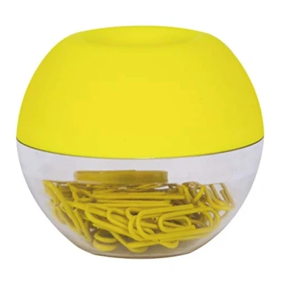 Distributeur de clips de 70 x 60 mm de diamètre. Couleur jaune. Idéal pour la maison, le bureau ou l'école. Distributeur composé de deux pièces : base transparente et couvercle magnétique coloré avec finition "soft touch". Comprend 50 clips de couleur jaune fluo de 28 mm.