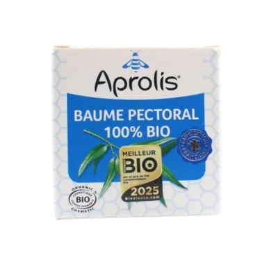 Le baume pectoral bio Aprolis est formulé avec de la propolis ainsi que 12 huiles essentielles. Il constitue un soin pectoral aux senteurs puissantes et synergiques disposant de 17 actifs.Testé dermatologiquement, le baume pectoral bio ne contient pas de camphre pour le plus grand confort des personnes allergiques. Le camphre est également déconseillé aux jeunes enfants, aux femmes enceintes ou qui allaitent.Bénéfices Le baume pectoral bio est à utiliser lors d’encombrements et de difficultés à respirer. La propolis purifie les bronches et débarrasse l’appareil respiratoire d’une trop grande quantité de mucus. Ce baume pectoral permet de faciliter la respiration et le désencombrement des voies respiratoires. Conseils d'utilisationEn cas d’encombrement pour faciliter la respiration, frictionner 2 à 3 fois par jour une noisette de baume sur le thorax et le dos. A conserver au frais après ouverture.Précautions d'emploiNe convient pas aux enfants de moins de 6 ans et aux femmes enceintes ou allaitantes. Éviter toute exposition au soleil et contact avec les yeux et les muqueuses. Usage externe.CompositionPrunus armeniaca kernel oil*, simmondsia chinensis oil*, prunus amygdalus dulcis oil*, cera alba*, eucalyptus globulus oil*, melaleuca quinquenervia oil*, mentha piperita oil*, citrus medica limonum oil*, alcohol**, cupressus sempervirens cone oil*, propolis*, cedrus atlantica bark oil*, thymus mastichina oil*, albies alba miller oil*, lavandula angustifolia oil*, thymus vulgaris leaf oil*, myrtus communis oil*, pseudotsuga menziesii oil*, limonene (1), linalool (1), citral(1).* issus de l’agriculture biologique** transformés à partir d’ingrédients biologiques(1) constituants naturels des parfums et huiles essentiellesIndicationsEncombrements, difficultés à respirerAdultes et enfants à partir de 6 ansConditionnementPot de 50 ml