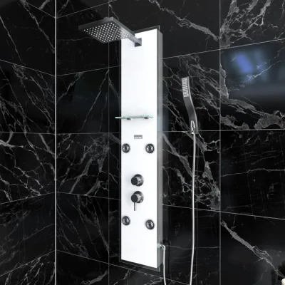 Colonne de douche en verre peint - Douche de tête chromée - Douche à main anticalcaire - 4 buses de massage - Mitigeur mécanique - Tablette en verre extra-clair - Sytème de fixation murale - Livré avec flexibles de raccordement - Garantie 1 an pièces uniquement