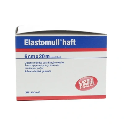 Au niveau des articulations ou lors de la fixation d'attelles de plâtre, les bandes de fixation traditionnelles "glissent" facilement. Ce n'est pas le cas d'Elastomull® haft. La bande élastique cohésive est recouverte d'un polymère synthétique sans latex. Ainsi, les différentes couches d'enveloppement adhèrent les unes aux autres de manière particulièrement sûre. Il en résulte une excellente tenue, sans plis, avec une application rapide et économe en matériel. Grâce à la technique de tissage particulière et aux fils de polyamide frisés très élastiques, Elastomull® haft possède une excellente élasticité qui reste intacte même après un port prolongé. Elastomull® haft est composé de 40 % de coton, 30 % de viscose et 30 % de polyamide. Application Pour la fixation de pansements sur toutes les parties du corps, en particulier sur les articulations : pour la fixation d'attelles de plâtre, etc. comme antidérapant sous les bandages de compression comme bandage de soutien léger, par exemple après le retrait d'un plâtre ou d'une bande Durée d'utilisation Courte durée, d'un à plusieurs jours Dimensions 6 cm x 20 m