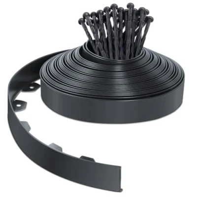 MONTAGE FACILE ET RAPIDE : La bordure de jardin s’installe rapidement et facilement dans votre espace de jardin extérieur. Il suffit simplement de poser la bordure autour des abords et fixer avec les piquets. MATÉRIAU SOUPLE ET FLEXIBLE : Notre bordure de jardin flexible peut être facilement pliée dans n'importe quel angle et coupée pour s'adapter à différentes formes, qu'elles soient rondes, carrées ou incurvées, vous pouvez créer un jardin personnalisé selon vos préférences. LONGUE DURÉE : Conçue en matériau PVC de haute qualité, notre bordure offre une résistance exceptionnelle aux intempéries. Sa durabilité garantit une performance et une longévité remarquables, même sous des conditions climatiques extrêmes. LONG PIQUET : Notre bordure de pelouse est équipée des 40 piquets de fixation en forme d’hélice afin de mieux se fixer au sol. De plus, la longueur de 20cm assure une meilleure tenue dans le sol. DIMENSIONS : Longueur : 20M ; Hauteur : 50mm ; Epaisseur : 2mm ; Longueur du piquet : 20cm