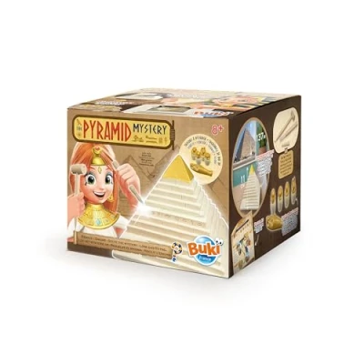 Déchiffre les hiéroglyphes gravés sur les 4 faces et trouve le mécanisme secret pour ouvrir la pyramide Déterre 5 trésors d’Egypte antique avec les outils inclus avec embout en métal ou lesté Expose ta pyramide et les trésors dans ta chambre Notice illustrée et poster A3 en couleurs Dès 8 ans, Éditeur: BUKI France