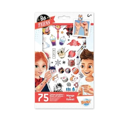 75 tatouages temporaires qui s’appliquent à l’aide d’une éponge humide! Contient 2 planches pour un total de 75 tatouages Modèle mixte Manga et Kawaï Dès 6 ans, Éditeur: BUKI France