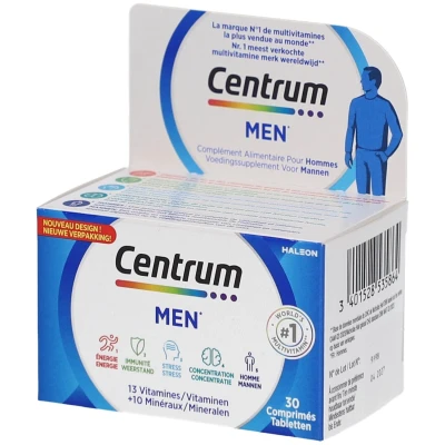 Complément alimentaire à utiliser dans le cadre d’une alimentation variée, équilibrée et d’un mode de vie sain.Centrum Men propose donc une formule complète avec:13 vitamines essentielles+11 minéraux dosés pour les hommesCentrum Men est un complexe multivitaminé unique scientifiquement adapté aux besoins spécifiques des hommes. Il leur apporte tout ce dont leur corps a besoin pour rester en forme au quotidien.Composition:Phosphate dicalcique ; Oxyde de magnésium ; Carbonate de calcium ; Agents de charge : E460, E468 ; Vitamine C ; Amidon modifié ; Niacinamide ; Vitamine E ; Maltodextrine ; Fumarate ferreux ; Agents de charge : E464, E1200 ; D-pantothénate de calcium ; Oxyde de zinc ; Sulfate de manganèse ; Emulsifiant : E470b ; Amidon ; Agents antiagglomérants : E551, E553b ; Gélatine ; Vitamine B6 ; Vitamine B2 ; Vitamine B1 ; Bêta-carotène ; Huile de palme ; Sulfate de cuivre ; Saccharose ; Vitamine A ; Sirop de glucose ; Acide folique ; Chlorure de chrome ; Molybdate de sodium ; Iodure de potassium ; Sélénate de sodium ; Biotine ; Antioxydant : E321 ; Vitamine K ; Vitamine D ; Vitamine B12 ; Colorants : E171, E132.Valeurs nutritionnelle: Pour 1 compriméAJR*VITAMINE A800 µg100 %VITAMINE B11,6 mg145 %VITAMINE B22,1 mg150 %VITAMINE B320 mg125 %VITAMINE B57,5 mg125 %VITAMINE B62,1 mg150 %VITAMINE B862,5 µg125 %VITAMINE B9200 µg100 %VITAMINE B123 µg120 %VITAMINE C120 mg150 %VITAMINE D5 µg100 %VITAMINE E18 mg150 %VITAMINE K30 µg40 %Calcium200 mg25 %Chrome40 µg100 %Fer3,75 mg28 %Phosphore105 mg15 %Iode100 µg67 %Cuivre500 µg50 %Magnésium120 mg32 %Manganèse2 mg100 %Molybdène50 µg100 %Sélénium30 µg55 %Zinc5 mg50 %*Apport journalier de référenceConseil d'utilisation:1 comprimé par jour pendant au moins 30 jours pour garder la forme.Précautions d'emploi:Ne pas dépasser la dose journalière recommandée. Tenir hors de portée des enfants. Hypersensibilité à l'un des constituants. A conserver à l'abri de la chaleur et de l'humidité. Sur avis médical en cas de prise d'anticoagulants.Poids net:47 g = 30 comprimésFabricant:Pfizer23.25 Avenue du Docteur Lannelongue75014 Paris