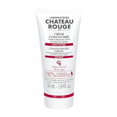 La Crème Concentrée Château Rouge est spécialement formulée pour corriger et atténuer les marques pigmentaires. Enrichie en actifs marins et végétaux, elle lutte efficacement contre les hyperpigmentations localisées tout en respectant la sensibilité des peaux noires, mates et métissées.IndicationConvient pour réduire les taches pigmentaires telles que le masque de grossesse, sur les mains, le visage ou le cou. Idéal pour les peaux noires, mates et métissées.ApplicationAppliquer matin et soir uniquement sur les taches en massant légèrement jusqu'à absorption complète. Éviter le contact avec les yeux.IngrédientsAqua (Water), Glycerin, Caprylic/Capric Triglyceride, Propanediol, Triticum Vulgare (Wheat) Germ Oil, Tribehenin Peg-20 Esters, C10-18 Triglycerides, Pentylene Glycol, Behenyl Alcohol, Dimethicone, Ethylhexyl Methoxycinnamate (Octinoxate), Glycyrrhiza Glabra (Licorice) Root Extract, Algae Extract, Arctostaphylos Uva Ursi Leaf Extract, Arginine, Carbomer, Propylene Glycol, Tocopheryl Acetate, Xanthan Gum, Lactic Acid, Parfum (Fragrance), Sodium Hydroxide, Citric Acid, Potassium Sorbate, Sodium Benzoate, Bht, Limonene, Linalool, Citral, Eugenol.