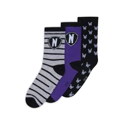 Design officiel Wednesday Addams : montrez style et fandom avec des chaussettes pour femme de qualité supérieure inspirées de la série Netflix. Lot de 3 avec différents motifs – Des designs variés en noir, gris et violet pour toutes les humeurs et tous les looks. Confort de port élevé – Le mélange doux de coton (76 % de coton) assure une respirabilité et une sensation agréable sur la peau toute la journée. Ajustement parfait : la taille élastique et la zone du talon stable offrent un maintien sûr, même en cas de mouvement au quotidien ou à l'école. Cadeau idéal pour les fans – Produit officiel sous licence, joliment emballé et parfait comme petite attention pour tout fan de Wednesday.