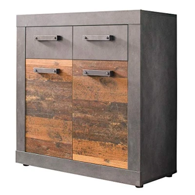 CdiscountINDY - Meuble chambre. Commode 2 tiroirs en mélaminé coloris gris ciment et 2 portes bois effet vieilli . L - H - P : 82 / 86 / 37cm. 2 etageres Conseil dentretien : Utiliser un chiffon de coton humide. Ne pas utiliser de nettoyant agressif comportant des additifs. Ne pas utiliser de