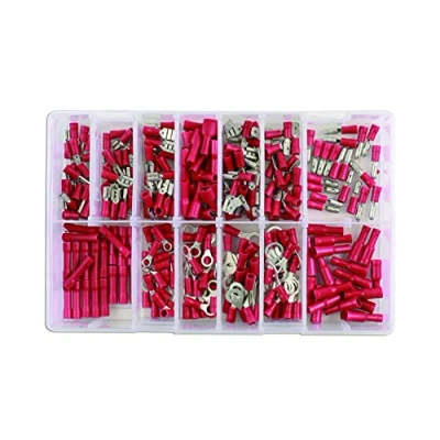 Includes Blade, Spade, Bullet and Ring terminals. Cable entry : 0.5mm2 to 1.5mm2. 260pc assorted box. Connect;Workshop;Consumables;Assorted;Red;Terminals;Box;Qty;260;Electrical;Assortments; spade; bullet; ring; connector; connectors;