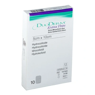 Taille du pansement:5 cm x 10 cmIndications:Pansement primaire ou secondairePeut être utilisé sur les déchirures de la peau, les plaies superficielles, les plaies sèches ou légèrement exsudatives, le tissu nouvellement formé et sur la peau à risque d’autres rupturesDescription du produit:Conçu pour réduire les risques d’autres ruptures de la peau causées par la friction. Le pansement DuoDERM™ Extra-Mince peut être utilisé comme pansement primaire, sur les plaies sèches ou légèrement exsudatives.Ce pansement peut aussi servir de pansement secondaire pour fixer un pansement Aquacel™ ou un pansement Aquacel™ Ag.Dans leurs lignes directrices, le European Pressure Ulcer Advisory Panel (Epuap) et le National Pressure Ulcer Advisory Panel (Npuap) recommandent d’utiliser des hydrocolloïds dans la prise en charge des ulcères de pression1.Le pansement DuoDERM™ Extra-Mince peut être utilisé pour la prise en charge des ulcères de pression de stade I et de stade II. Conseils d'utilisation:Lire attentivement le mode d'emploi.Composition:PolyuréthaneConditionnement:Boîte de 10 pansements
