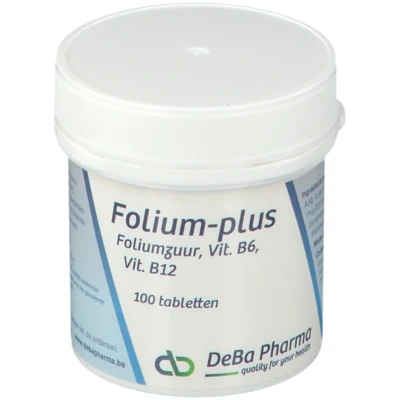 Complément alimentaire à utiliser dans le cadre d’une alimentation variée, équilibrée et d’un mode de vie sain.Le fonctionnement de l’acide folique est soutenu par la vitamine B6 et la vitamine B12, une combinaison qui contribue à un métabolisme normal de l’homocystéine. Des valeurs d’homocystéine plus élevées entraînent un risque accru de maladies cardiovasculaires. De plus, l’acide folique contribue : à la croissance tissulaire de la mère pendant la grossesse à un métabolisme énergétique normal à une hématopoïèse normale à la diminution de la fatigue et de la lassitudeCarence en acide folique : la fatigue, l’asthénie; la pâleur, des valeurs d’homocystéine plus élevées. Pour les femmes enceintes, il est conseillé de prendre 400 mcg d’acide folique par jour. En plus de « Folium-plus », nous proposons également « Folium Aktief » dans notre assortiment. Dans cette formule, nous offrons les vitamines B sous leur forme active.IngrédientsAcide folique (Vitamine B9), Vitamine B6 (pyridoxine Hcl), Vitamine B12 (Cyanocobalamine), Microkristalline cellulose (stabilisant), Magnésiumstéarate (anti-agglomérant), Siliciumdioxide (anti-agglomérant).Valeurs nutritionnelles Par 1/2 comprimé % AJR* Acide folique (Vitamine B9) 800 µg 400 % Vitamine B6 (pyridoxine HCL) 12 mg 857 % Vitamine B12 (Cyanocobalamine) 6 µg 240 % Conseils d'utilisation1/2 comprimé par jour, avec un peu d'eau.Précautions d'emploiTenir hors de portée des jeunes enfants. Conserver au frais et au sec.Poids net15 g = 100 comprimésAdresse du FabricantDeba PharmaDumolinlaan 13B-8510 Kortrijk