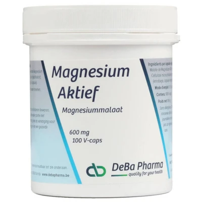 Complément alimentaire à utiliser dans le cadre d’une alimentation variée, équilibrée et d’un mode de vie sain.Magnésium Actif contient du malate de magnésium comme substance active. Le malate est le sel de l’acide malique et est naturellement largement présent dans les pommes et d’autres fruits, entre autres. L’acide malique est l’une des substances qui font partie du cycle de l'acide citrique et est par conséquent essentiel pour la formation d’ATP; la source d’énergie pour l’activité corporelle. Le magnésium est un minéral dont une grande partie est présente dans nos os et nos muscles. Le magnésium est tout comme le calcium un électrolyte. Les crampes musculaires sont une indication importante d’une carence en magnésium.Le magnésium contribue :à la diminution de la fatigue et de l'épuisementà un bon équilibre électrolytiqueà un métabolisme énergétique normalau fonctionnement normal du système nerveuxau fonctionnement normal des musclesà une synthèse normale des protéinesà une fonction psychologique normaleau maintien de dents et os sainsLe magnésium joue également un rôle dans le processus de division cellulaire.IngrédientsPar gélule végétale : malate de magnésium 600 mg dont magnésium élémentaire 90 mg (24 % Ajr*) ; stabilisant : cellulose microcristalline ; agent d'enrobage : hydroxypropylméthylcellulose.* Apport journalier de référenceConseils d'utilisation1 à 5 gélules par jour, à prendre avec un peu d'eau.Précautions d'emploiConserver dans un endroit frais et sec.Tenir hors de portée des jeunes enfants.Ne pas dépasser la dose recommandée.Poids net100 gélulesAdresse du FabricantDeba PharmaDumolinlaan 13,8510 CourtraiBelgique