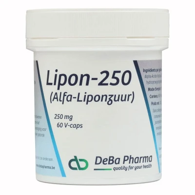 Complément alimentaire à utiliser dans le cadre d’une alimentation variée, équilibrée, d’un mode de vie sain.Lipon-250 de Deba Pharma est un complément alimenaire à base d'acide-alpha lipoïque. Ce produit ne contient pas de lactose, de gluten ni de conservateurs, de colorants ou d'arômes.Composition:Acide alpha-lipoïque, cellulose microcristalline (stabilisant), hydroxyl-propyl-métylcellulose (gélule végétale)Valeur nutrititive: Par gélule végétaleAcide-alpha lipoïque 250 mgConseil d'utilisation:1 à 2 capsules par jour avec un peu d'eauPrécautions d'emploi:Conserver hors de portée et de vue des enfants. A conserver dans un endroit frais et sec. Ne pas dépaser la quantité journalière recommandée.Poids net:28,2 g = 60 gélules végétalesFabricant:Deba PharmaNeerhofstraat 45B-8560 Wevelgem