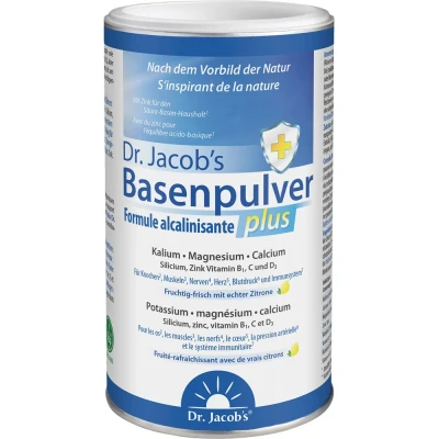 Equilibre acido-basique à l’image de la natureLe saviez-vous? Seuls environ 10% des Allemands consomment les 5 portions quotidiennes de fruits et légumes recommandées. Les légumes et les fruits sont riches en minéraux essentiels, comme le potassium, le calcium et le magnésium, mais contiennent peu de sodium.Dr. Jacob’s Formule alcalinisante plus s’inspire de la nature. Il associe des minéraux organiques sous forme de citrate et de lactate, avec un rapport naturel de calcium à magnésium d’environ 3:2, une quantité élevée de potassium et peu de sodium. Enrichi en zinc, il soutient votre équilibre acido-basique.*1 portion (6 g) de Dr. Jacob’s Formule alcalinisante plus offre un pouvoir alcalinisant équivalent à celui de 800 g de fruits et légumes, selon l’indice Pral (charge acide potentielle pour les reins). Avec une seule mesurette, vous pouvez compenser la charge acide généralement apportée par l’alimentation.*Rabenberg, Mensink (2011): – RKI (éd.): GBE kompakt 2; 6.****Remer, Manz (2003): Am J Clin Nutr, 78(4), 802-3.Le compagnon idéal pour votre régime avec du vrai citronDr. Jacob’s Formule alcalinisante plus est agrémenté d’une touche de citron et délicatement sucré à l’extrait de stevia.** Les personnes au palais fin peuvent détecter le goût du potassium qu’il contient. Mélangé à de l’eau gazeuse, il révèle toute sa fraîcheur.Dr. Jacob’s Formule alcalinisante plus n’est pas seulement le compagnon idéal pour un régime, c’est aussi une excellente boisson isotonique. Une simple mesurette dans un litre d’eau ou de jus de légumes suffit à recharger votre corps en minéraux après l’effort.Renforcez votre système immunitaire – restez en bonne santé et plein de vitalitéAvec l’âge, il devient de plus en plus essentiel de s’assurer d’un apport suffisant en nutriments. Les micronutriments clés pour l’immunité, tels que la vitamine C, la vitamine D et le zinc, jouent un rôle central à cet égard.*40 bienfaits prouvés pour votre santéLes micronutriments contenus dans Dr. Jacob’sFormule alcalinisante plus apportent 40 bienfaits prouvés pour votre santé, contribuant notamment aux fonctions suivantes de l’organisme:Métabolisme acido-basique – zincSystème immunitaire – vitamine D, vitamine C, zincSanté des os et des dents – calcium, magnésium, vitamine DSystème nerveux (potassium, magnésium), transmission des signaux entre les cellules nerveuses – calciumFonction musculaire– potassium, magnésium, calciumMaintien d’une pression sanguine normale – riche en potassium, pauvre en sodiumFonction cardiaque– vitamine B1Métabolisme énergétique et réduction de la fatigue – magnésiumSanté de la peau, des cheveux et des ongles – zincParticipe à la division cellulaire – calcium, vitamine DProtection cellulaire contre le stress oxydatif – vitamine CEnzymes digestives – calciumFormation normale du collagène pour assurer la fonction normale de la peau et du cartilage (composants des articulations) – vitamine CFonctions psychologiques (pensée, ressenti, humeur) – magnésiumPour la formation du collagène, la peau, les cheveux et les ongles*Notre peau, nos cheveux et nos ongles reflètent notre bien-être. Le stress, le manque de sommeil et un apport insuffisant en nutriments peuvent impacter leur santé.Dr. Jacob’s Formule alcalinisante plus contient notamment du zinc, un oligo-élément qui aide à maintenir la santé de la peau, des cheveux et des ongles. Le calcium et la vitamine D jouent un rôle crucial dans la division cellulaire. La vitamine C aide à protéger les cellules contre le stress oxydatif et favorise la formation de collagène dans la peau.* Le collagène étant la protéine la plus abondante dans le corps, un apport suffisant en nutriments permet de maintenir la santé de votre peau, de vos cheveux et de vos ongles.*Plus d’énergie et de moments de détente*Dans l’agitation du quotidien, il est souvent difficile de trouver le bon équilibre entre énergie et moments de détente. Le stress engendre fréquemment des tensions au niveau du cou et des épaules. Dans ces moments-là, on opte aussi plus souvent pour des snacks tels que des chips ou des sodas que pour des légumes comme les épinards. Les minéraux essentiels comme le magnésium, le potassium et le calcium sont ainsi souvent délaissés.Il s’agit pourtant d’un trio idéal pour vos nerfs. Ces trois minéraux travaillent ensemble pour assurer le bon fonctionnement de vos nerfs et de vos muscles.Le calcium permet de conserver une contraction musculaire normale, tandis que le magnésium favorise la relaxation musculaire et lutte contre la fatigue.*Ainsi, vous pouvez aborder votre quotidien avec plus d’énergie et de sérénité intérieure.*Pourquoi le potassium est-il si important?Le potassium agit directement au niveau des cellules et est l’un des minéraux les plus essentiels, tant dans notre alimentation que dans chacune de nos cellules corporelles. Il est nécessaire pour le bon fonctionnement de nos nerfs et de nos muscles, ainsi que pour maintenir une pression sanguine normale. Cependant, en Allemagne, la consommation de sel (chlorure de sodium) est trop élevée, tandis que celle de potassium reste insuffisante (NVS2).Excellent rapport qualité/prixDr. Jacob’s Formule alcalinisante plus offre un prix par portion nettement plus avantageux, en termes de teneur en minéraux-citrates alcalins, calculés selon la valeur Pral (charge acide potentielle des reins), par rapport aux produits concurrents.*BénéficesLa poudre alcalinisante la plus riche en potassium – avec un petit plus pour votre système immunitaire*Poudre alcalinisante la plus riche en potassium, avec du calcium et du magnésium dans un rapport de 3:2.Minéraux sous forme de citrate et de lactate provenant d’Europe.Plus de 40 bienfaits pour la santé: soutient le système immunitaire, les os, les nerfs, les musc