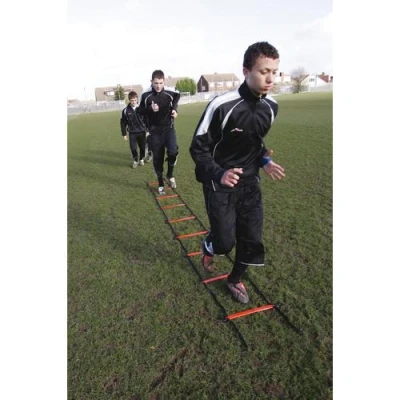 Échelons en plastique liés en nylon de 20" de large. Espace entre les échelons d'environ 15".Force les pieds à s'adapter à des schémas de mouvements de pieds très rapides en répétant les exercices encore et encore.Fournie avec un sac.