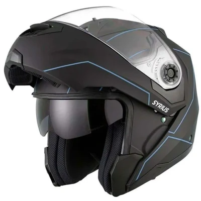 Le casque modulable SYRIUS est avec sa coque ABS sa bavette intégrée et son protège nez vous apporteront une excellente protection contre les intempéries. Équipé dune visière transparente traitée anti-rayures dune visière solaire votre qualité de conduite sera améliorée. Un passage pour les porteurs de lunette est prévu au niveau des mousses. Le casque modulable SYRIUS est homologué ECE R 22.06.