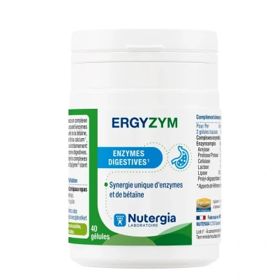 Complément alimentaire à utiliser dans le cadre d’une alimentation variée, équilibrée et d’un mode de vie sain.Ergyzym est une synergie unique associant de la bétaïne à un complexe de 6 enzymes d’origine naturelle :lipase (digestion des graisses)protéase (digestion des protéines)amylase et cellulase (digestion des glucides)lactase (digestion du lactose)tolerase® G (dégradation du gluten)Ergyzym contient également du calcium qui participe au fonctionnement normal des enzymes digestives, et des vitamines B2 et B3 qui contribuent au maintien des muqueuses normales.Ergyzym est formulé en gélule végétale gastro-résistante DR Caps®.Sans gluten, sans caséine; sans lactose.Quand est-il conseillé ?Ergyzym pourra être conseillé pour soutenir le fonctionnement enzymatique normal au cours de la digestion, grâce au calcium. Il sera ainsi particulièrement adapté pour l'équilibre digestif en cas de repas copieux (riche en protéines; glucides, lipides, excès d’alcool) ou pris trop rapidement (mastication insuffisante), ainsi qu’en cas de sensibilité digestive au gluten ou au lactose par exemple.IngrédientsLithothamne (Phymatolithon calcareum Pall.), DigeZyme® (amylase, protéase; cellulase, lactase, lipase), chlorhydrate de bétaïne; Tolerase® G (prolyl-oligopeptidase), antiagglomérant : sels de magnésium d’acides gras, vitamines B3 (nicotinamide), B5 (D-pantothénate de calcium) et B2 (riboflavine). Gélule végétale gastro résistante DR Caps® (hydroxypropylmethylcellulose issu de pulpe de pin).Convient à une alimentation végétarienne ou végane.Données nutritionnelles Pour 2 gélulesActivité enzymatiqueApport de RéférenceComplexes enzymatiques88 mg Amylase18 mg3 600 DU*-Protéase9 mg900 PC**-Cellulase4 mg165 CU***-Lactase7 mg600 U****-Lipase0,24 mg150 U****-Prolyl-oligopeptidase (Tolerase® G)50 mg29 000 PPI*****-Betaïne HCl100 mg--Calcium120 mg-15%Vitamine B20,21 mg-15%Vitamine B32,4 mg-15%Vitamine B50,9 mg-15%* Dextrinizing units**Protease Unit***Cellulase unit**** Unit*****Peptidyl-prolyl isomeraseConseils d'utilisationsDose journalière recommandée1 gélule aux 2 principaux repas (soit 2 gélules par jour).Ne pas ouvrir la gélule.Précautions d'emploiConserver dans un endroit frais et sec.Tenir hors de portée des enfants.Ne pas dépasser la dose recommandée.Réservé à l’adulte.Déconseillé aux femmes enceintes ou allaitantes.Ne pas consommer en cas d’allergie à l’un des constituants.Ce pot contient une gélule déshydratante à ne pas ingérer.Poids net40 gélulesFabricantLaboratoire NutergiaRue de La Science 11400 NivellesBelgique