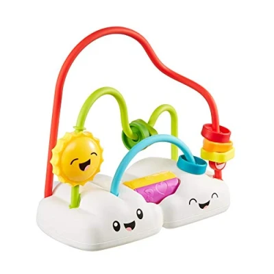 Trois rails colorés avec perles coulissantes Perles multicolores de différentes formes à faire glisser sur les rails Rouleau à tourner pour produire un bruit de hochet Soleil double face qui cliquette en tournant Développe la dextérité et la capacité à résoudre des problèmes de manière ludique