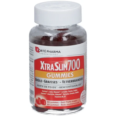 Complément alimentaire à utiliser dans le cadre d’une alimentation variée, équilibrée et d’un mode de vie sain.Forté Pharma XtraSlim 700 GummiesXtraSlim 700 est une formule innovante qui a été développée par une équipe scientifique. Elle est composée de 8 ingrédients complémentaires.Une formule unique et très complète :Le XtraSlim 700 est composé de 4 extraits de plantes choisis pour leur action minceur et de 4 nutriments essentiels qui agissent sur le métabolisme pour une action complémentaire. Action sur le tri-métabolisme grâce à la présence de la choline (qui contribue à un métabolisme lipidique normal), du chrome (qui contribue au maintien d'une glycémie normale et au métabolisme normal des macronutriments) et de la vitamine B6 (qui contribue au métabolisme normal des protéines et du glycogène). Le produit a été testé scientifiquement.BIENFAITS4 extraits végétaux pour une formule unique :Une association de curcuma et de wakamé : le wakamé contribue au métabolisme des graisses, qui aide au contrôle du poids et à la réduction de l’appétit.Le cassis qui facilite les fonctions d'élimination de l'organisme et la perte de poids en complément de mesures diététiques.Le konjac.La formule de la vitamine B1 contribue à l'équilibre du système nerveux et un métabolisme énergétique normal. L’équilibre émotionnel est utile dans toute démarche minceur afin de faciliter la réduction des prises alimentaires et tenir son objectif minceur.Contenu : 60 gélulesIngrédientsPar dose journalière :Complexe Liposlim [extraits de wakamé (Undaria pinnatifida) (405 mg) et de curcuma (Curcuma longa) (45 mg)], agent de charge (carbonate de calcium), glucomannane de konjac (Amorphophallus konjac) (200 mg), choline bitartrate (82,5 mg équivalent choline), extrait sec de feuilles de cassis (Ribes nigrum L.) (2000 mg équivalent plantes), agent de charge (cellulose microcristalline), antiagglomérants (dioxyde de silicium, stéarate de magnésium); vitamine B6 (pyridoxine), chlorure de chrome, vitamine B1 (thiamine).Données nutritionnellesTeneur en vitamines et minérauxPar dose journalièreThiamine (vit. B1)0,55 mg (50 % VNR*)Vitamine B60,70 mg (50 % VNR*)Chrome150 µg (375 % VNR*)* VNR = Valeurs nutritionnelles de référenceConseils d'utilisation2 gélules; 2 fois par jour, pendant 1 mois.Soit 2 gélules avant les 2 principaux repas avec un grand verre d'eau.À renouveler jusqu'à 3 mois consécutifs.Précautions d'emploiConserver dans un endroit frais et sec.Tenir hors de portée des enfants.Ne pas dépasser la dose recommandée.Déconseillé aux femmes enceintes ou qui allaitent et aux enfants de moins de 12 ans sans avis médical. Consulter un médecin ou pharmacien en cas d’usage concomitant d’anticoagulants. Ne pas utiliser en cas de sensibilité à l’iode ou de troubles de la thyroïde.FabricantLaboratoires Forté Pharma41 avenue Hector Otto98000 MonacoFrance
