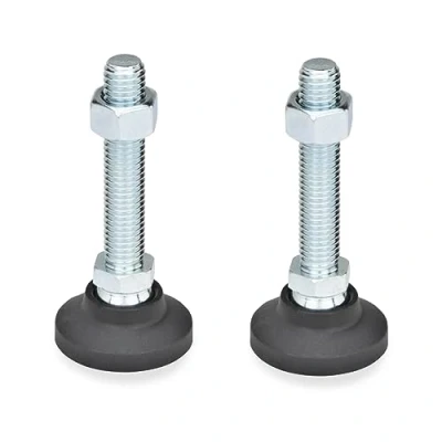 Diamètre du pied d1 : 60 mm - Filetage d2 : M20 - Longueur du filetage : 138 mm - Hauteur du pied : 35,5 mm Unité d'emballage : 2 pieds articulés Pied : plastique (polyamide), renforcé de fibre de verre, noir, mat, résistant à la température jusqu'à 100 °C Broche de réglage/écrou hexagonal ISO4032 : acier, classe de résistance 5.8, galvanisé, bleu passivé Coussin en caoutchouc (NBR) : 70 Shore A, noir