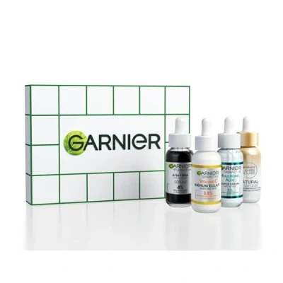 Coffret cadeau contenant 4 sérums adaptés à chacun de vos besoins. N’oubliez pas : votre peau évolue au cours des semaines et des mois. Nos sérums peuvent s’utiliser en complémentarité Sérum Anti-Taches : Réduisez vos taches brunes en appliquant 1 pipette matin et soir sur visage propre. Faites pénétrer dans la peau, appliquez ensuite votre crème de jour ou crème de nuit Sérum Anti-imperfections : Affinez votre grain de peau et uniformisez votre teint en appliquant le sérum sur visage propre. Faites soigneusement pénétrer dans la peau. À utiliser en sérum quotidien (matin et soir) ou spécifiquement sur les boutons Sérum Repulpant Hyaluronic Aloe : Hydratez et repulpez votre peau en appliquant 1 pipette matin et soir sur visage propre. Faites pénétrer dans la peau, appliquez ensuite votre crème de jour ou crème de nuit Sérum Autobronzant Visage : Obtenez un teint hâlé sur-mesure, progressif en mélangeant 4-12 gouttes de sérum avec une crème hydratante. Appliquez uniformément sur visage et cou propres, Estompez avec un coton à la racine des cheveux et sourcils Contenu : 1x Coffret cadeau 4 sérums Garnier, Inclus : 1x Sérum Anti-Tache à la Vitamine C (30 ml), 1x Sérum Anti-Imperfections au Charbon, Niacinamide et AHA+BHA (30 ml), 1x Sérum Hyaluronic Aloe (30 ml), 1x Sérum Autobronzant Visage (30 ml)