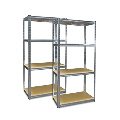 Cadre en métal entièrement galvanisé / étagères en panneau MDF Charge maximale : 175 kg par tablette / 1400 kg complet. Dimensions : env. 160 x 160 x 40 cm Montage individuel grâce au système d'emboîtement Traverses pour plus de stabilité