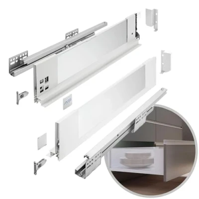 Construction et certification durables : le tiroir AXIS PRO avec parois en verre se caractérise par une longue durée de vie et est certifié pour un impressionnant 60 000 cycles. Extension complète et mécanisme de fermeture amortie : la rallonge complète est disponible en longueurs de 300 à 550 mm, et le mécanisme de fermeture douce assure un fonctionnement silencieux et une fermeture en douceur du tiroir. Verre trempé pour plus de durabilité et de facilité d'entretien : le verre trempé utilisé est résistant aux dommages et facile à nettoyer. Le tiroir est conçu avec des côtés en verre de seulement 14 mm de large pour tirer le meilleur parti de l'intérieur de l'armoire. Grande capacité de charge et utilisation polyvalente : le tiroir peut contenir des produits pesant jusqu'à 40 kg. Elle est adaptée à différents systèmes de gestion de l'espace, aux inserts de couverts, aux tapis et au tri des déchets. Montage et réglage faciles : le tiroir est basé sur des rails à fermeture douce AXIS PRO et offre un montage facile. Les possibilités de réglage de l'intérieur, l'inclinaison et le réglage horizontal dans la plage de +/- 2 mm facilitent l'ajustement. Le kit de verre monté est préfabriqué, ce qui facilite le travail du menuisier, car aucune découpe de verre n'est nécessaire. Le tiroir est de couleur anthracite et s'harmonise parfaitement avec le verre fumé noir.