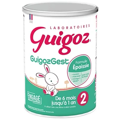 Il est important d'avoir une alimentation variée et équilibrée et un mode de vie sain.La formule Guigoz® GuigozGest 2 répond aux besoins nutritionnels spécifiques de votre bébé dès 6 mois jusqu'à 1 an dans le cadre d'une alimentation diversifiée*. @@@F6TBSq15oUVhj3dsJIhQ4ioKhDV8goyE@@@ est épaissie** à l'amidon et contient :Des FOS/GOS***Du Dha* (acide docosahexaénoïque) issu d'huile de poisson et de l'AAL* (acide alpha-linolénique), deux acides gras essentiels de la famille des Oméga 3. Le DHA contribue au développement normal de la vue des nourrissons****, et l'AAL participe au développement normal de leur cerveau.Du Fer*, des vitamines A*, C* et D*qui contribuent au fonctionnement normal du système immunitaire.Une qualité et une quantité de protéines ajustées*.*Conformément à la réglementation sur les laits de suite.**A utiliser avec une tétine à débit variable.***Fructo-oligosaccharides et Galacto-oligosaccharides.****Pour un apport quotidien de 100 mg.IngrédientsLAIT écrémé, huiles végétales (tournesol riche en acide oléique, colza, tournesol), amidons, lactosérum doux déminéralisé, lactose, perméat de lactosérum déminéralisé, galacto-oligosaccharides, Minéraux (citrates de calcium, de potassium et de sodium; chlorures de magnésium et de sodium; phosphate de calcium; sulfates ferreux, de zinc, de cuivre et de manganèse; iodure de potassium, sélénate de sodium), huile de POISSON, émulsifiant (lécithine de SOJA), fructo-oligosaccharides, Vitamines (A, B1, B2, B3, B5, B6, B8, B9, B12, C, D, E, K), antioxydants (extrait riche en tocophérols, palmitate de L-ascorbyle), culture de L. reuteri DSM 17938*.Sans huile de palme*Sous licence BioGaia AB.Allergènes : Poisson, Soja, Lait.Valeurs nutritionnelles Unités Pour 100g Pour 100 ml** ENERGIE kJ 2103 284 kcal 502 68 LIPIDES g 24,4 3,3 dont acides gras saturés g 2,3 0,3 dont acide linoléique mg 3550 474 dont acide α-linolénique mg 360 48 dont acide docosahexaénoïque (DHA) mg 125 16,7 GLUCIDES g 59,7 8 dont sucres g 43,5 5,8 dont lactose g 42 5,6 PROTEINES g 10,9 1,5 Caséine g 6,5 0,9 Protéines de lactosérum g 4,4 0,6 VITAMINES ET MINERAUX Vitamine A µg-ER 430 57,4 Vitamine D µg 12 1,7 Thiamine (B1) µg 500 66,7 Riboflavine (B2) µg 1050 140 Niacine (B3) mg 4 0,53 Acide pantothénique (B5) mg 3,8 0,51 Vitamine B6 µg 300 40 Biotine (B8) µg 15 2 Folates (B9) µg-EFA 140 18,7 Vitamine B12 µg 1,4 0,19 Vitamine C mg 90 12 Vitamine K µg 35 4,7 Vitamine E mg α-ET 9,5 1,3 Sodium mg 230 30,7 Potassium mg 660 88,1 Chlorure mg 360 48,1 Calcium mg 490 65,4 Phosphore mg 300 40 Magnésium mg 48 6,4 Fer mg 6,6 0,9 Zinc mg 4 0,5 Cuivre µg 390 52,1 Iode µg 100 13,4 Sélénium µg 22 2,9 Manganèse µg 150 20 Fluorure µg
