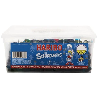 LES INCONTOURNABLES SCHTROUMPFS EN BONBONS : Le grand Schtroumpf et son bonnet rouge, la Schtroumpfette et ses cheveux blonds et leurs compagnons à bonnet blanc... tous sauront vous régaler ! BON!BON À SAVOIR : Ces délicieux bonbons gélifiés sont fabriqués avec amour sans colorant artificiel. LE PLAISIR DE PARTAGER : À déguster en solo, en famille ou entre amis, ces délicieuses confiseries sont conditionnées en vrac en boîte hermétique d'environ 210 unités. L'idéal pour partager ses bonbons et passer un moment convivial ! POUR TOUTES LES OCCASIONS : Pour un anniversaire, Halloween, une Kermesse, un carnaval... ou simplement pour le plaisir de se faire plaisir, les bonbons HARIBO Schtroumpfs sont les compagnons parfaits pour toutes les joyeuses occasions. HARIBO, C'EST BEAU LA VIE : Depuis sa création il y a plus de 100 ans, HARIBO régale des générations entières de gourmands à travers le monde. Les produits HARIBO constituent une petite parenthèse sucrée, un lien avec l’enfance, un instant de douceur dans notre quotidien.