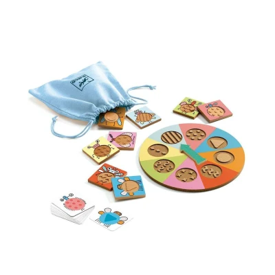 Pouvez-vous trouver l\'élément qu\'indique la roue de la roulette ? Les insectes amusants de Bzz vous aideront.Un jeu d\'observation dans lequel les enfants doivent prêter attention au symbole indiqué par la roue, pour essayer de l\'identifier entre les différents jetons et cartes en utilisant le sens du toucher et de la vue.FonctionnalitésMatériau : bois, cartonTaille de l\'emballage : 21,5 x 21,5 x 3 cmComprend : 1 roulette en bois gravé, 8 jetons en bois gravés, 24 cartes et un sac en tissuVous pouvez l\'emporter partout dans le sac en tissu qui est inclusDéveloppe la motricité fine, le toucher et l\'attention