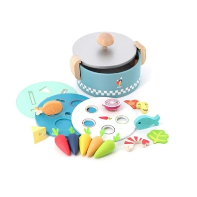 Jeu de reconnaissance tactile qui consiste à reconnaître les différentes formes, couleurs et utiliser les différents ingrédients pour cuisiner.Il comporte 3 cercles de formes différentes qui sont placés sur le dessus du pot. L\'objectif est de trouver les bons trous pour introduire les différents ingrédients dans le pot afin que l\'on puisse manger. Ce jeu aide à développer le sens logique et la motricité fine des enfants.CaractéristiquesMatériau : boisMesures : 22 x 14 x 19 cmComprend 41 piècesÀ partir de 2 ans