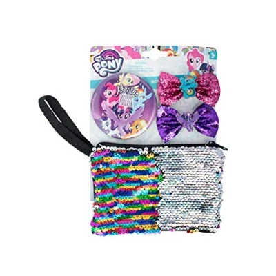 AmazonMy Little Pony Set Contenu : 2 barrettes à cheveux, un miroir et une trousse de beauté à paillettes magiques Dimensions : 14,5 x 2 x 21 cm Le sac de beauté est pourvu de sequins réversibles. Fais passer les paillettes vers le haut et les paillettes changent de couleur. Un superbe cadeau pour les fans de My Little Pony., Éditeur: Joy Toy