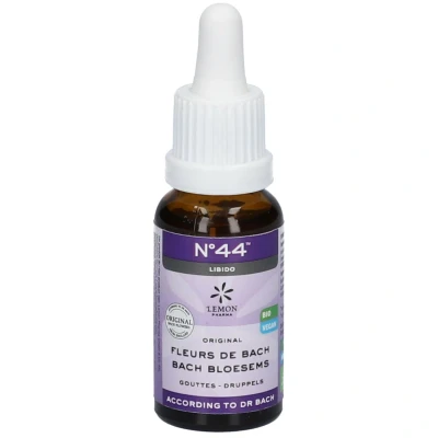 Mélange de Fleurs de Bach Original BIO sous forme de gouttesBénéfices Qualité bio certifiée Dilution originale: 1 : 240 Végan; Goût: sans arômesIndications Fleurs De Bach Bio N°44 Libido est conseillé pour les personnes qui ont une libido affaiblie, diminuée. Pour plus de confiance en soi. Aide à retrouver le désir et la sensualité. Le but des Fleurs de Bach est de rétablir votre équilibre émotionnel et l'harmonie inétieure.Adaptées à l’application domestique.Conseils d'utilisationDiluer trois à quatre gouttes dans un verre d’eau et le boire à gorgées. Alternativement, verser les Fleurs de Bach non diluées directement sur la langue.Principaux actifsLe mélange Original N°44 contient les 7 Fleurs de Bach suivantes:Wild Rose Fleur de la joie de vivre Hornbeam Fleur du dynamisme Gentian Fleur de la foi Impatiens Fleur du calme intérieur Larch Fleur de la confiance en soi Pine Fleur du pardon Crab Apple Fleur de la purificationComposition Brandy* (27% Vol.), 0,5 % essences de Fleurs de Bach*: églantier, charme, gentiane, balsamine de l’Himalaya, mélèze, pin sylvestre, pommier sauvage(*Issus de culture biologique)Conditionnement Flacon à pipette de 20 ml