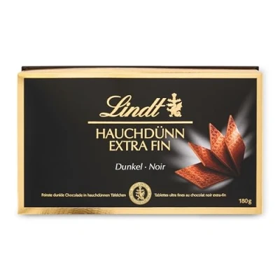 CdiscountBoîte Lindt Extra Fin Noir 180g Lindt Extra Fin - Une tendre et pure saveur chocolatée Découvrez la finesse du meilleur Chocolat Noir Lindt parachevé sous forme dexceptionneles petites tablettes ultra fines créées par les Maîtres Chocolatiers Lindt. La forme filigrane sans pareil permet aux Extra Fins de Lindt de f