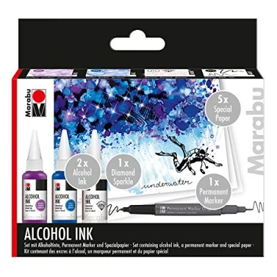Encre permanente à base d'alcool, pour des techniques de défilement polyvalentes (FFluid Art) et des designs créatifs dans le lot initial Couleurs brillantes grâce à l'utilisation de colorants de haute qualité, mélangeables entre eux, à séchage rapide et sans acide Convient pour toutes les surfaces non absorbantes telles que le verre, le métal, la céramique et le papier spécial revêtu imperméable La texture liquide crée des nuances de couleurs intéressantes, qui se détachent et peuvent être retravaillées en ajoutant de l'alcool Contenu : 3 x 20 ml Alcohol Ink (gentian, améthyste, diamant), 1 x marqueur permanent (noir), 5 x papier spécial DIN A6, 1 x prospectus DIN A5