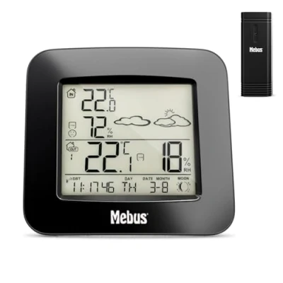 Commande radio (DCF 77) : la station météo se règle automatiquement à l'heure correcte, y compris le réglage de l'heure d'été ou d'hiver. L'heure peut être réglée manuellement, par exemple pour les endroits sans signal radio Plus de Mebus : visitez la boutique MEBUS sur Amazon pour plus de réveils, horloges murales et stations météo Prévisions météo : dans la partie supérieure droite de l'écran, les prévisions météorologiques actuelles sont affichées en fonction des valeurs mesurées.