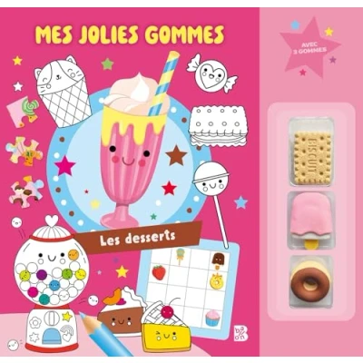 Dans ce livre, tu trouveras plein de jeux amusants et de jolis coloriages sur le thème des desserts. Et ce n'est pas tout : trois adorables gommes sont incluses !