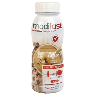 Veillez à avoir une @@@OOsiPTuEcvr1JsDBaM/GM5f1f30tx2Gm@@@ équilibrée et variée et à mener un mode de vie sain.modifast® Boisson amaigrissante intensive Café Modifast Drink Coffee est un substitut de repas prêt à l'emploi au goût délicieux de café. Grâce à son emballage individuel pratique, cette boisson Modifast est idéale lorsque vous êtes en déplacement.Ingrédients :Lait écrémé, eau, sucre, protéines du lait, huile de tournesol. Arôme, épaississant : Cellulose, carboxyméthylcellulose de sodium et carraghénanes, minéraux (citrate de sodium, citrate de potassium, sels de potassium de l'acide phosphorique, oxyde de magnésium, hydroxyde de potassium, sulfate ferreux, sulfate de zinc, sulfate de cuivre, sulfate de manganèse, sélénite de sodium, vitamines (C, A, E, D, B1, B6, B2, niacine, acide pantothénique, acide folique, biotine), sirop de glucose, arôme naturel, amidon de blé, édulcorant, acésulfame-K, lactoseValeurs nutritionnelles : Pour 100 g % AJR* Par boisson (236 ml) % AJR* Energie 389 kJ / 93 kcal 918 kJ / 219 kcal Graisses - dont acides gras saturés 2,5 g 0,3 g 5,9 g 0,7 g Glucides - dont sucres 10 g 10 g 24 g 24 g Fibres 2,2 g 5,2 g Protéines 6,4 g 15 g Sel 0,22 g 0,52 g Vitamine A 219 µg 27 517 µg 65 Vitamine D 1,2 µg 24 2,8 µg 57 Vitamine E 2,4 mg 20 5,7 mg 47 Vitamine C 22 mg 28 52 mg 65 Thiamine 0,33 mg 30 0,78 mg 71 Riboflavine 0,34 mg 24 0,80 mg 57 Niacine 2,3 mg 14 5,4 mg 34 Vitamine B6 0,25 mg 18 0,59 mg 42 Acide folique 53 µg 27 125 µg 63 Vitamine B12 0,49 µg 20 1,2 µg 46 Biotine 3 µg 6 7,1 µg 14 Acide pantothenique 0,82 mg 14 1,9 mg 32 Potassium 254 mg 13 599 mg 30 Calcium 119 mg 15 281 mg 35 Phosphore 100 mg 14 236 mg 34 Magnesium 27 mg 7 63,7 mg 17 Fer 2,1 mg 15 5 mg 35 Zinc 2 mg 20 4,7 mg 47 Cuivre 0,23 mg 23 0,54 mg 54 Manganèse 0,23 mg 12 0,54 mg 27 Selenium 14 µg 25 33 µg 60 Iode 36 µg 24 85 µg 57 *Apport journalier de référencesConsommation recommandée :Boire une bouteille par jour en remplacement du repas.Note :Ne pas dépasser l'apport quotidien recommandé.Stockage : Conserver dans un endroit frais (6-25 °C) et à l'abri de la lumière. Tenir hors de portée des enfants.Quantité de remplissage nette :236 ml Fabricant : GSA Soins de santé 3 Rue des 4 Foyers 92100 Boulogne-BillancourtFrance
