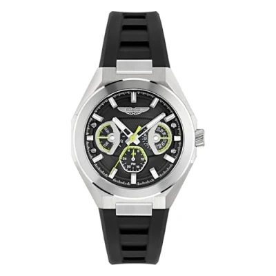 Fabricant :ASTON MARTINN° de modèle :MTRI1F502Cadran :analogique, Couleur : noirBoîtier :Boîtier en acier inoxydable de couleur argentée, lunette de couleur argentée, Diamètre d'environ 42,0 mm (sans couronne), hauteur d'environ 11,68 mm, poids d'environ 92 grammes,Fond du boîtier :Acier inoxydable vissé avec logo du fabricantBracelet :Bracelet en silicone, noir, Largeur : env. 1,2 cm longueur de la montre : env. 21,0 cmBoucle ardillon,Étanchéité :Etanche à 10 ATM (100 m)Fonctions / affichages :Chronographe Mouvement à quartz, Verre minéral avec revêtement saphir, Affichage des heures - minutes - secondes, Fonction date Aiguilles avec remplissage luminescentInfo :Créée pour le quotidien, conçue pour le mouvement. Cette montre TKS dispose d'un boîtier de 42 mm en acier inoxydable recyclé avec un mouvement multifonctionnel. Le bracelet en silicone noir dynamique assure confort et flexibilité, tandis que les détails d'essence de citron vert sur la courbe et les compteurs rappellent le design de la calandre d'Aston Martin. La construction latérale du boîtier confère une finition technique distinctive.