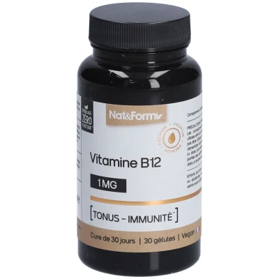 Complément alimentaire à utiliser dans le cadre d’une alimentation variée, équilibrée et d’un mode de vie sain.La vitamine B12 contribue au fonctionnement normal du système immunitaire et du métabolisme énergétique, participe à la formation normale de globules rouges et joue un rôle dans le processus de division cellulaire.IngrédientsGomme d’acacia (agent de charge), gélule d’origine végétale, vitamine B12 (méthylcobalamine)Valeurs nutritionnelles Pour 1 géluleVitamine B12 1000 µg (40000 % des VNR*)*Valeurs Nutritionnelles de Référence.Conseils d'utilisation1 gélule par jour.À avaler avec un grand verre d’eau lors du petit-déjeuner ou du déjeuner.Précautions d'emploiLes compléments alimentaires doivent être utilisés dans le cadre d’un mode de vie sain et ne pas être utilisés comme substituts d’un régime alimentaire varié et équilibré. Ne pas dépasser la dose journalière préconisée. Tenir hors de portée des enfants. La conservation s’effectue dans un endroit sec et à l’abri de la lumière.Enfants de moins de 12 ans, femmes enceintes ou allaitantes, consulter un professionnel de santé avant utilisation.Poids net10.4 g = 30 gélulesAdresse du FabricantLaboratoire Atlantic NatureZA de Kerloudan56270 PLOEMEURFrance