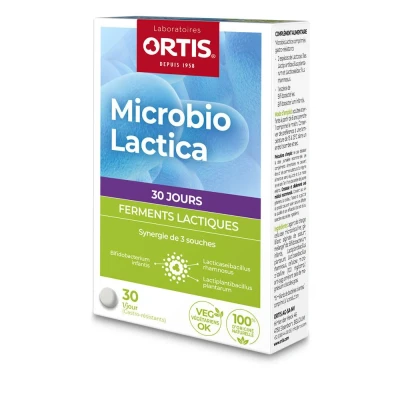 Complément alimentaire à utiliser dans le cadre d’une alimentation variée, équilibrée et d’un mode de vie sain.MicrobioLactica FloreBactéries lactiques 2 espèces de Lactobacilles: Lactobacillus plantarum et Lactobacillus rhamnosus 1 espèce de Bifidobactéries: Bifidobacterium infantis 15 milliards de ferments lactiques par comprimé (à la production) Comprimés gastro-résistants Enfants: à partir de 6 ansIngrédients: Agent de charge : cellulose microcristalline ; épaississant : alginate de sodium ; composition de Bifidobacterium infantis, Lactobacillus plantarum, Lactobacillus rhamnosus, cellulose microcristalline (100 mg/comprimé) ; anti-agglomérants : stéarate de magnésium, dioxyde de silicium.Conseils de consommation: Adultes et enfants à partir de 6 ans prendre 1 comprimé le matin.Précautions d'emploi Il est recommandé de ne pas dépasser la dose journalière recommandée. Tenir hors de portée des jeunes enfants. Un avis médical est recommandé en cas de grossesse ou d'allaitement. Convient aux végétariens. En raison de l'utilisation d'ingrédients naturels, la couleur, l'odeur et le goût de ce produit peuvent varier. Toutefois, cela n'affecte ni la qualité ni l'efficacité.Instructions de stockage:Conserver de préférence à une température de 15 à 25°C dans un endroit sombre et sec.Quantité nette: 30 comprimésFabricant: Ortis AG-SA-NV46 Derrière la poupeB-4750 Elsenborn/BütgenbachBelgique