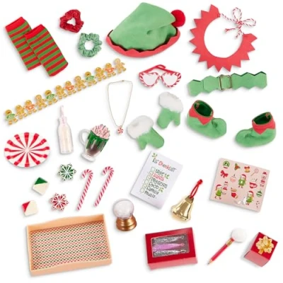 Calendrier de l'Avent amusant : Ouvrez chaque jour un cadeau après l'autre avec le calendrier de l'Avent Our Generation Holiday Elf Surprise Countdown Calendar, spécialement conçu pour les poupées de 46 cm! Dévoilez les surprises : les enfants peuvent déballer une variété d'objets cachés à l'intérieur des 24 portes du calendrier, ce qui les rend impatients de découvrir chaque nouvelle surprise au fur et à mesure qu'ils terminent le compte à rebours! Costume de lutin des fêtes : les enfants trouveront un chapeau de lutin, des chaussures bouclées et d'autres vêtements fantaisistes pour transformer leur poupée préférée de 46 cm en lutin magique! Accessoires et découpes festifs : le calendrier du compte à rebours comporte des accessoires festifs et des découpes de vacances derrière la couverture, que les enfants peuvent partager avec leurs poupées, leurs amis et leur famille pour des moments plus chaleureux. Contenu : comprend un costume de lutin, un collier, des lunettes, un plateau, une guirlande, 2 chouchous, une assiette, une feuille d'autocollants, une cloche, une liste de contrôle de lutin, un stylo, une boule à neige, une boîte avec 3 décorations en guirlande, 8 aliments pour le jeu et une boîte cadeau.