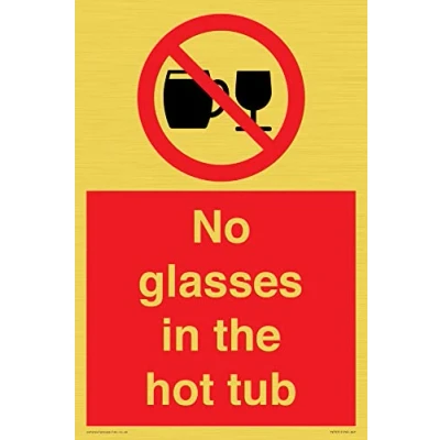 P503 : ne pas boire d'alcool Ce panneau est fabriqué à partir d'un autocollant en vinyle doré Autocollant effet métal doré pour surfaces planes et propres. Ne convient pas aux surfaces rugueuses, en plastique ou poussiéreuses. Format A4 portrait Texte : No Glasses in the hot tub