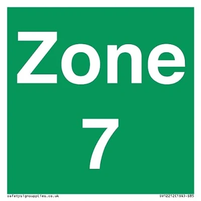 Pas de symbole Ce panneau est fabriqué à partir de plastique semi-rigide de 1 mm Plaque en plastique de 1 mm d'épaisseur, peut être vissée, collée avec de l'adhésif ou fixée avec des attaches de câble. Ne convient pas pour accrocher. S85 carré Texte du signe : Zone 7