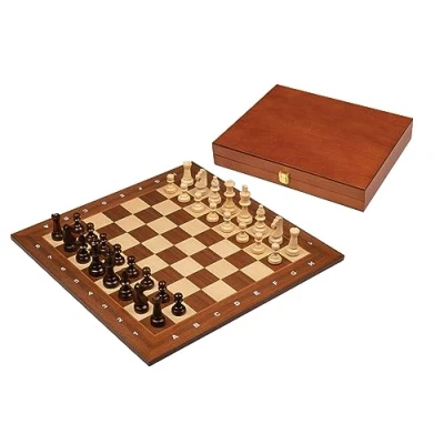 AmazonTournament wooden chess set by Philos with board and chess pieces in wooden storage box 500mm chess board with border numbers and letters. Square size: 50mm Weighted Staunton chess pieces with felted base; King height: 90mm Chess pieces conveniently stored in a wooden storage box High quality chess set complete with all the components needed for a game of chess, Éditeur: Philos